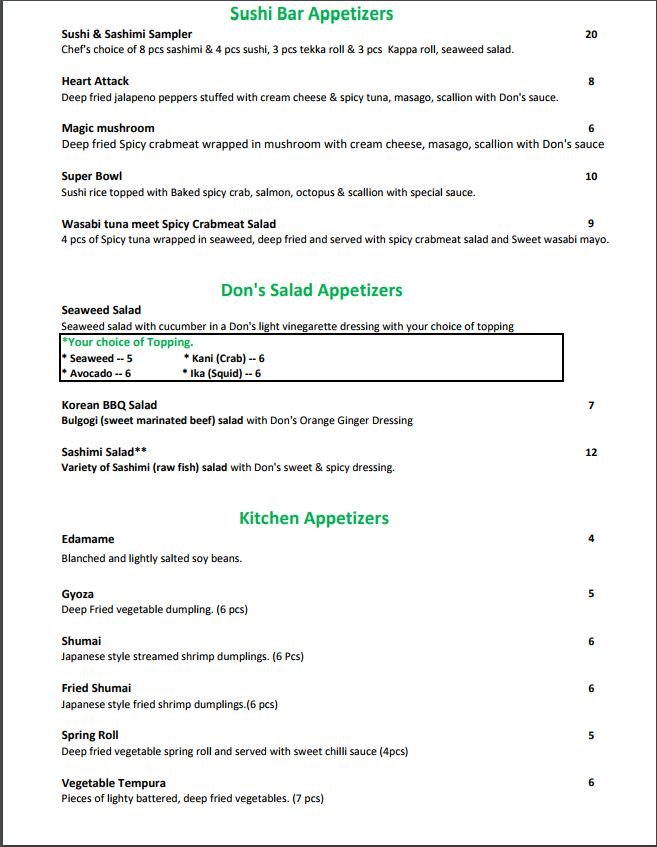 Variety of spicy tuna, spicy shrimp, spicy crabmeat, spicy salmon, that comes with rice and vegetables with Don's special sauce.