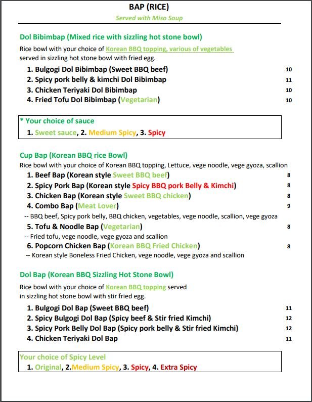 Hot stone bowl with Bulgogi, Kimchi, onion, cabbage, scallions with Korean Spicy sauce. P.S --Togo orders are not served at Hot Stone Bowl. Hot Stone Bowl available only at Dine-In. However, you can feel the unique taste of the ingredients.