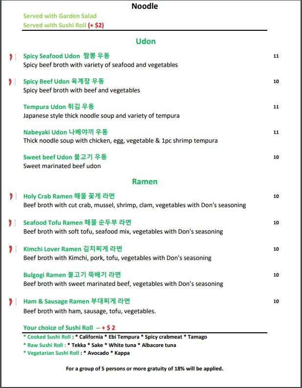 Sushi Don, located in Lafayette, IN, offers a wide range of Poke, Korean, and Sushi options. The menu includes vegan and vegetarian choices, with a variety of happy hour specials and alcohol offerings. Customers rave about the flavorful dishes, such as the Dakgangjeong appetizer and Spicy Bulgogi Dolsot, along with a selection of delicious rolls like the tuna, spider, and vegetarian options. The fast and friendly service, clean atmosphere, and affordable prices make Sushi Don a top choice for sushi lovers. With complimentary salad and miso soup for diners, along with efficient staff like waiter Noah, the dining experience at Sushi Don is sure to impress. Whether celebrating a special occasion or grabbing a quick bite, Sushi Don guarantees a satisfying meal.